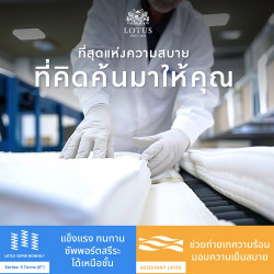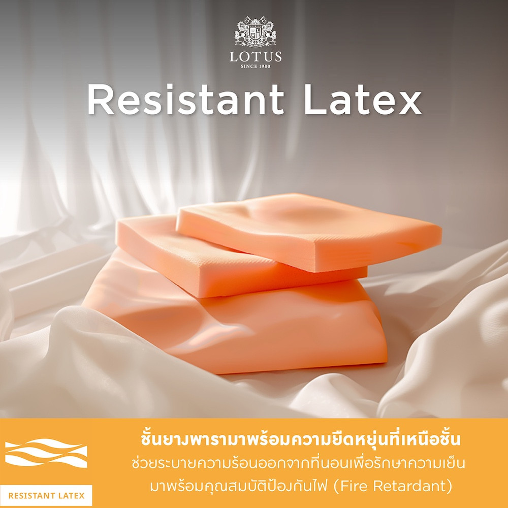 - Resistant Latex ยางพาราลิขสิทธิ์เฉพาะของ LOTUS มีคุณสมบัติสลายแรงกดทับให้กับสรีระจนสัมผัสได้ถึงความเบาสบายยามนอนหลับ มาพร้อมความพิเศษของวัสดุยางพารา ที่ยืดหยุ่นนุ่มนวลเป็นพิเศษ และสามารถทนต่ออุณหภูมิสูงเพื่อยับยั้งการติดไฟ (Fire Retardant) ได้ดีเยี่ยม ให้การพักผ่อนสุขสบายของคุณได้รับการดูแลตลอดทุกค่ำคืน