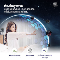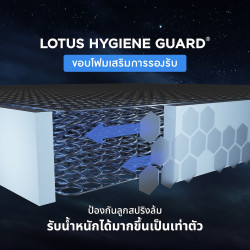 - เสริมขอบ Lotus Hygiene Guard® รอบโครงสร้างสปริง ปกป้องการฉีกขาดของผ้าหุ้มจากการเคลื่อนไหวของลูกสปริง อีกทั้งยังป้องกันฝุ่นละออง และสารสกปรกต่างๆ ไม่ให้สามารถเข้ามาฝังตัวในที่นอน ซึ่งเป็นอีกหนึ่งสาเหตุของการเกิดไรฝุ่น พร้อมระบบระบายอากาศหมุนเวียนอย่างมีประสิทธิภาพ