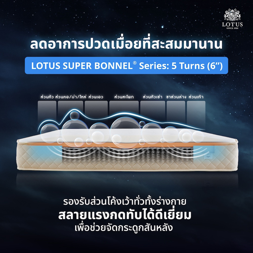 LOTUS SUPER BONNEL® Series: 5 Turns 6" ระบบเฉลี่ยน้ำหนักและกระจายแรงกดทับ ที่ดีที่สุด ขดลวดสปริงสูงถึง 6 นิ้ว เคลื่อนไหว นุ่มนวล ลดแรงกดทับ มอบความสบายขั้นสุด