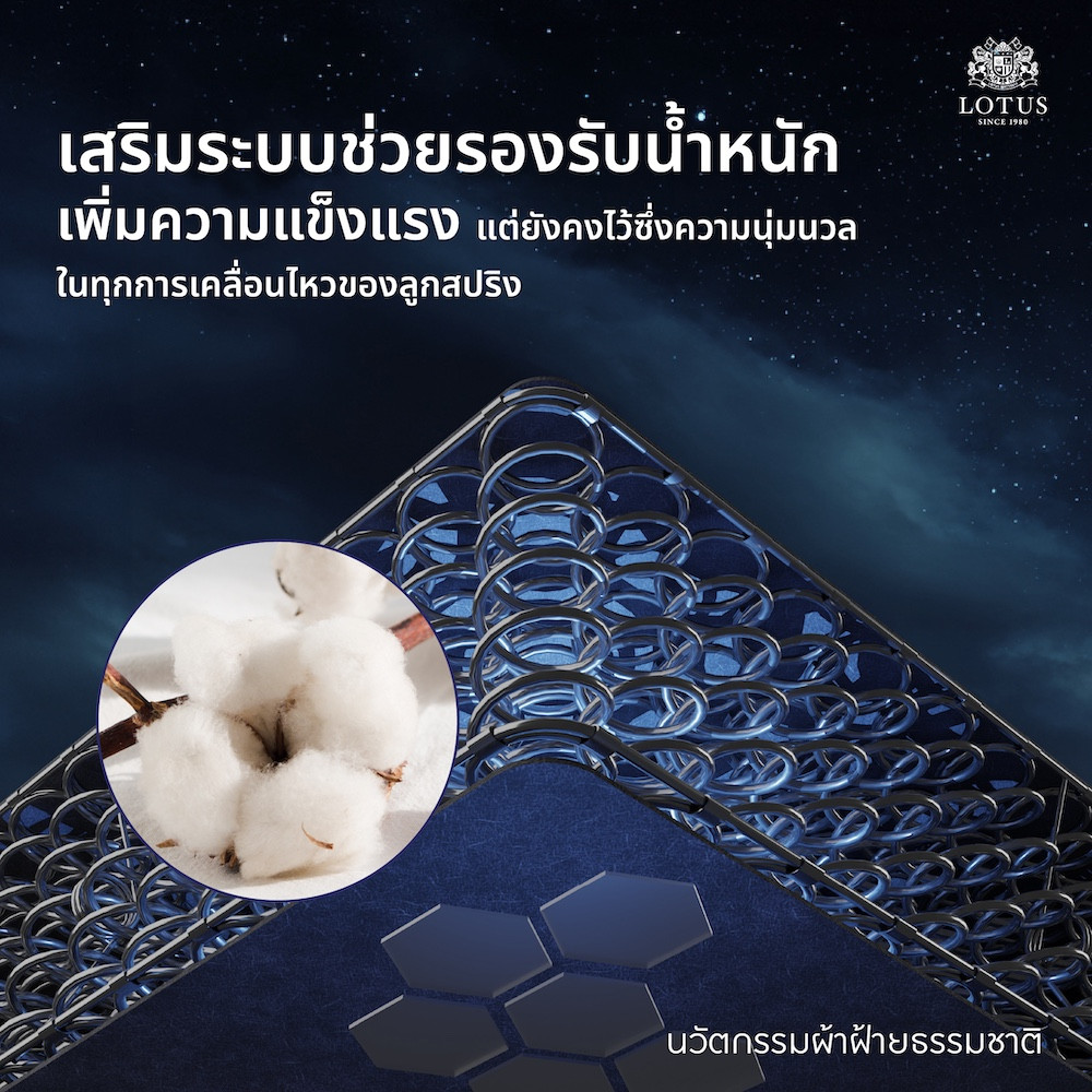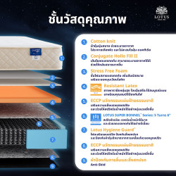 | ชั้นวัสดุคุณภาพ 1. Cotton Knit 2. Conjugate Holo Fill II 3. Stress Free Foam 4. Resistant Latex 5. ECCP นวัตกรรมแผ่นฝ้ายธรรมชาติ 6. LOTUS SUPER BONNEL® Series: 5 Turns 6" 7. Lotus Hyginene Guard® 8. ECCP นวัตกรรมแผ่นฝ้ายธรรมชาติ 9. ผ้าป้องกันการลื่นและสิ่งสกปรก |