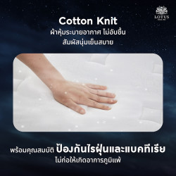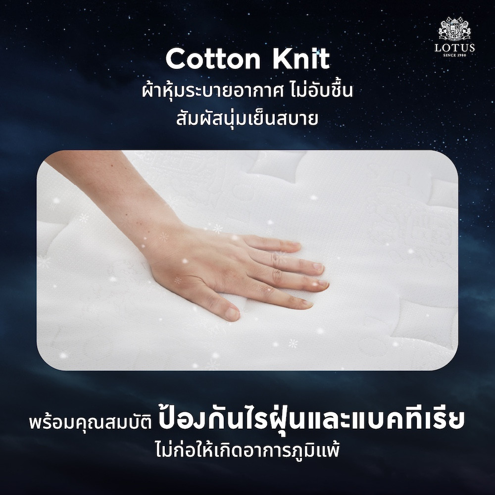 - Cotton Knit ผ้าหุ้มสัมผัสเนียนนุ่ม ไม่ระคายเคืองผิวพรรณ มาพร้อมคุณสมบัติระบายอากาศ มอบความเย็นสบาย และยับยั้งการสะสมของไรฝุ่นและแบคทีเรีย