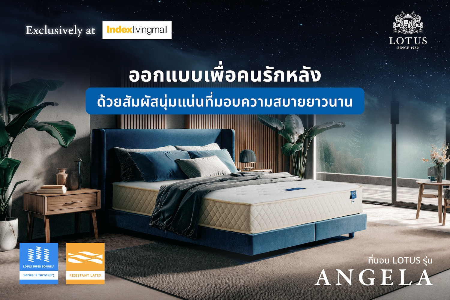 ที่นอน LOTUS รุ่น Angela รองรับทุกอิริยาบถของการนอน ตอบโจทย์ทุกความสบายกับสัมผัสนุ่มแน่นอย่างลงตัว ด้วยการรองรับน้ำหนักจากสปริง LOTUS SUPER BONNEL® Series: 5 Turns ที่ออกแบบให้รองรับน้ำหนักได้อย่างมั่นคงและกระจายแรงกดทับอย่างทั่วถึง ช่วยลดอาการปวดเมื่อยหลังจากการนอนหลับยาวนาน เสริมด้วยชั้น Resistant Latex นวัตกรรมยางพาราที่ให้ความยืดหยุ่นสูง ช่วยซัพพอร์ตแนวกระดูกสันหลังให้สมดุล ให้ความรู้สึกเบาสบายไร้แรงกดทับ และมอบสัมผัสที่เนียนนุ่มด้วยผ้าหุ้ม Cotton Knit ที่มีคุณสมบัติในการระบายอากาศ ช่วยป้องกันความอับชื้นและแบคทีเรียสะสม เพื่อค่ำคืนที่หลับสบายและผ่อนคลายบนอย่างยาวนาน