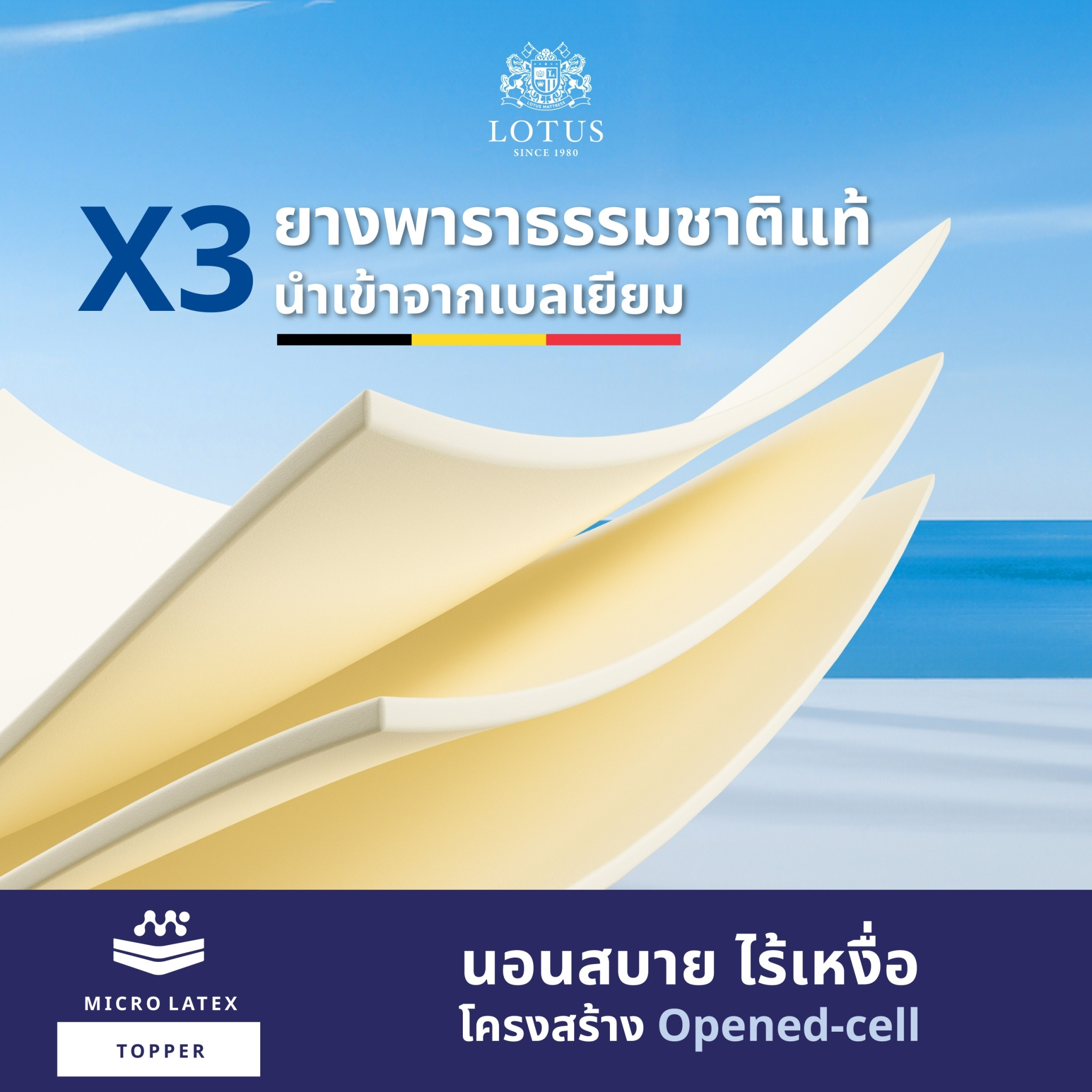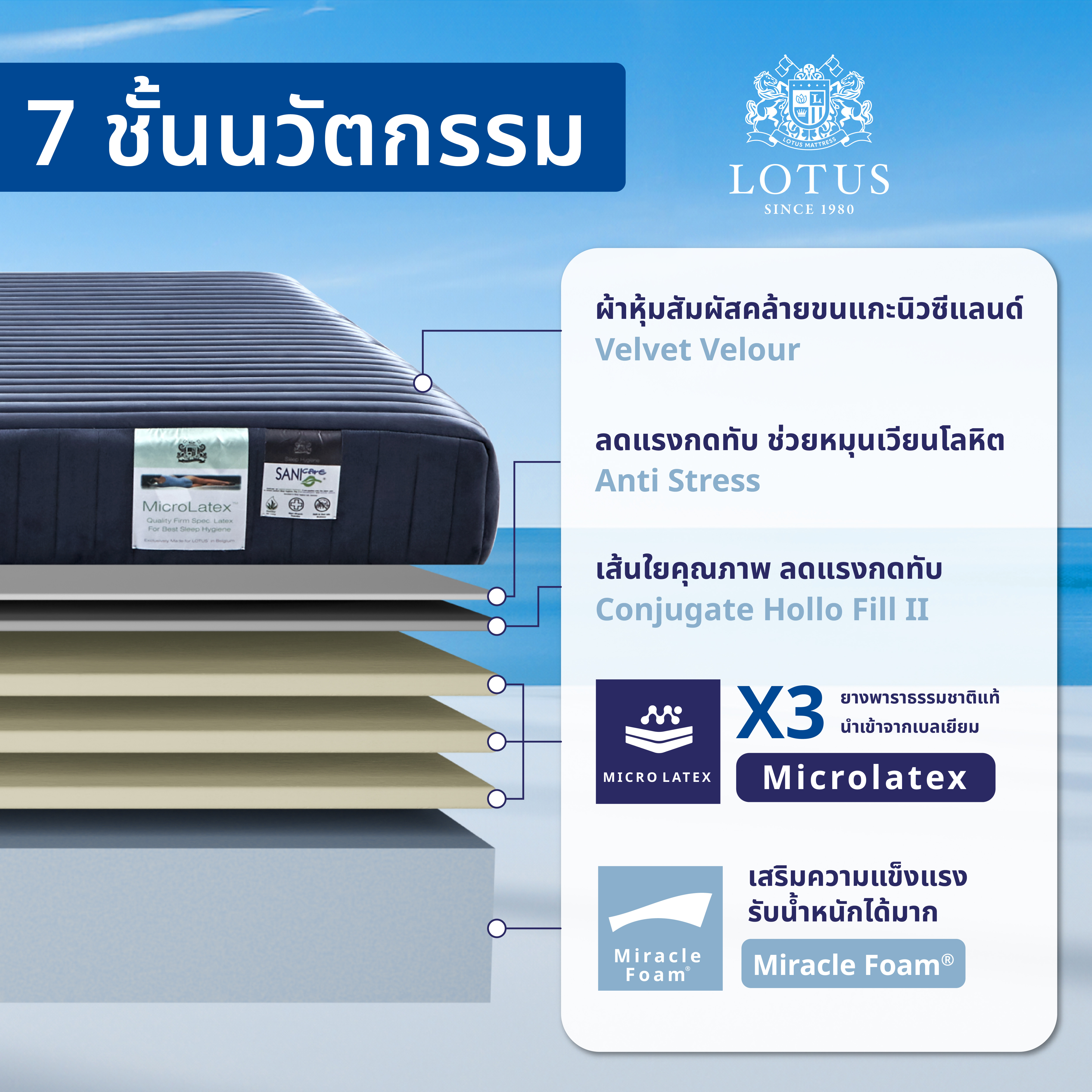 - ไมโครลาเท็กซ์ (Microlatex®) 3 นิ้ว (7.5 เซนติเมตร) ยางพาราธรรมชาติผ่านกระบวนการอัดแน่นพิเศษ (Micro compression of Natural Latex) จากประเทศเบลเยี่ยมลิขสิทธิ์เฉพาะของที่นอนโลตัส แน่นเป็นพิเศษ แต่ยังคงไว้ซึ่งความนุ่มสบายในทุกสัมผัส