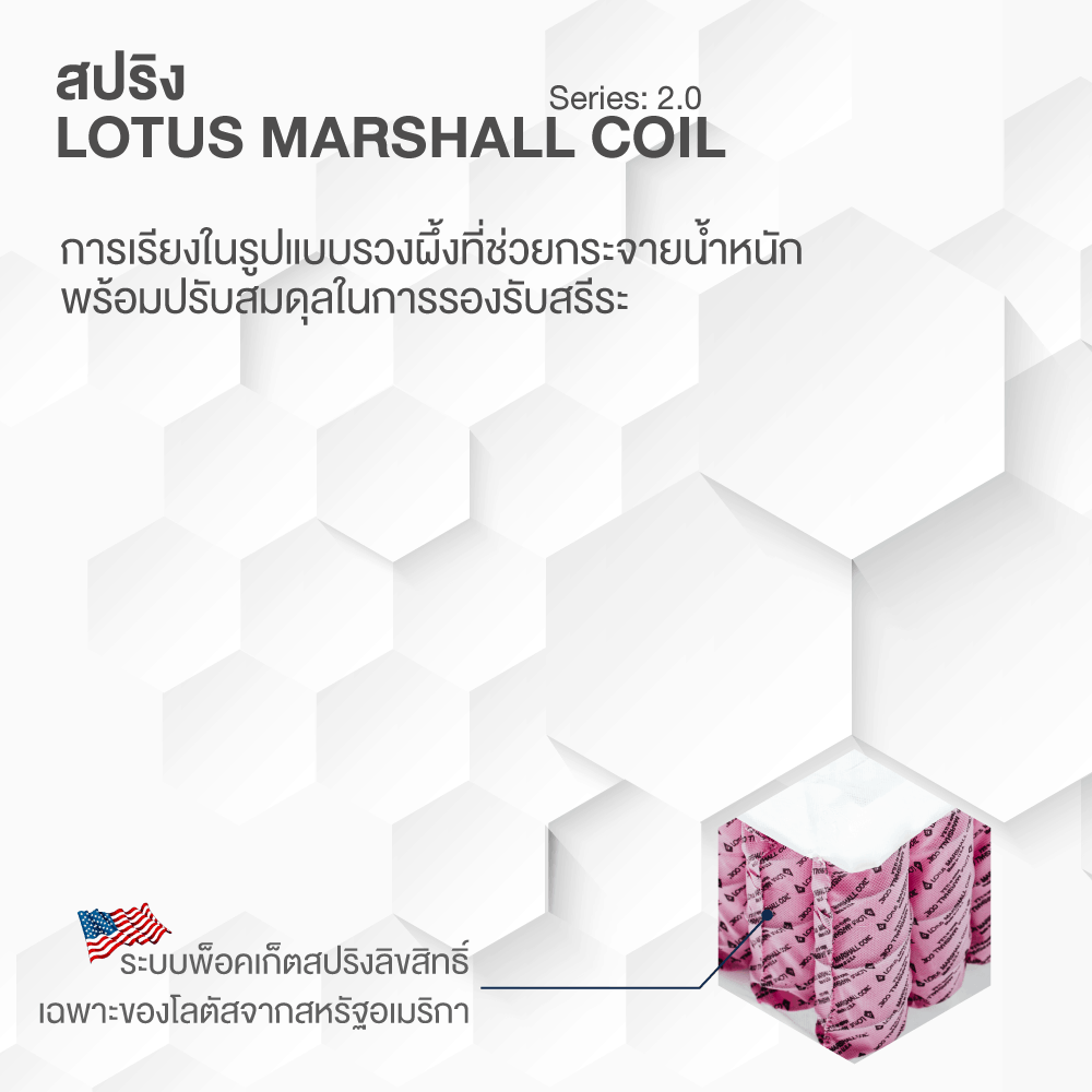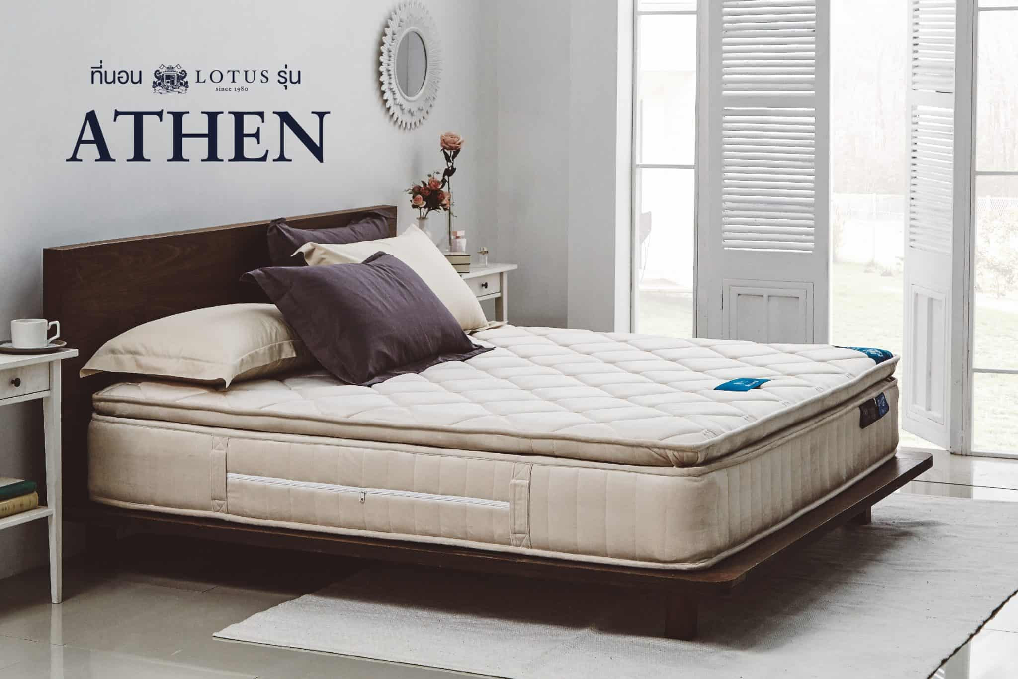 ใหม่ ที่นอนโฟม สปริง รุ่น Athen จาก LOTUS มาพร้อมความพิเศษ สปริง LOTUS MARSHALL COIL® Series: 2.0 – ระบบพ็อกเก็ตสปริง Marshall Coil ® ลิขสิทธิ์เฉพาะของโลตัสจากสหรัฐอเมริกา รุ่น Plush Comfort (2.0) ด้วยผลิตขึ้นตามหลักวิศวกรรมการนอนแนวใหม่ ท่านจึงสามารถสัมผัสได้ถึงระดับการรองรับแบบนุ่มปานกลางจากแผ่นนวด Massage Contour Pad และชั้นโฟม HD Comfort ภายใต้ตัวพิลโลว์ ท้อป และเน้นที่การโอบรัดสรีระรองรับน้ำหนักอย่างเป็นธรรมชาติ เพราะสปริงแต่ละลูกทำงานแบบอิสระทำให้ขจัดปัญหาการสั่นไหวรบกวนคนข้างเคียง มีสินค้า 3 ขนาด 3.5 ฟุต, 5 ฟุต, 6 ฟุต