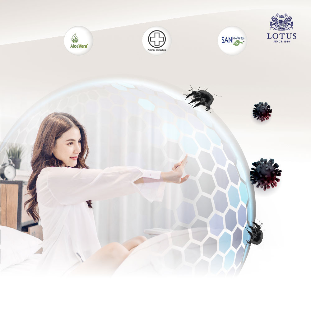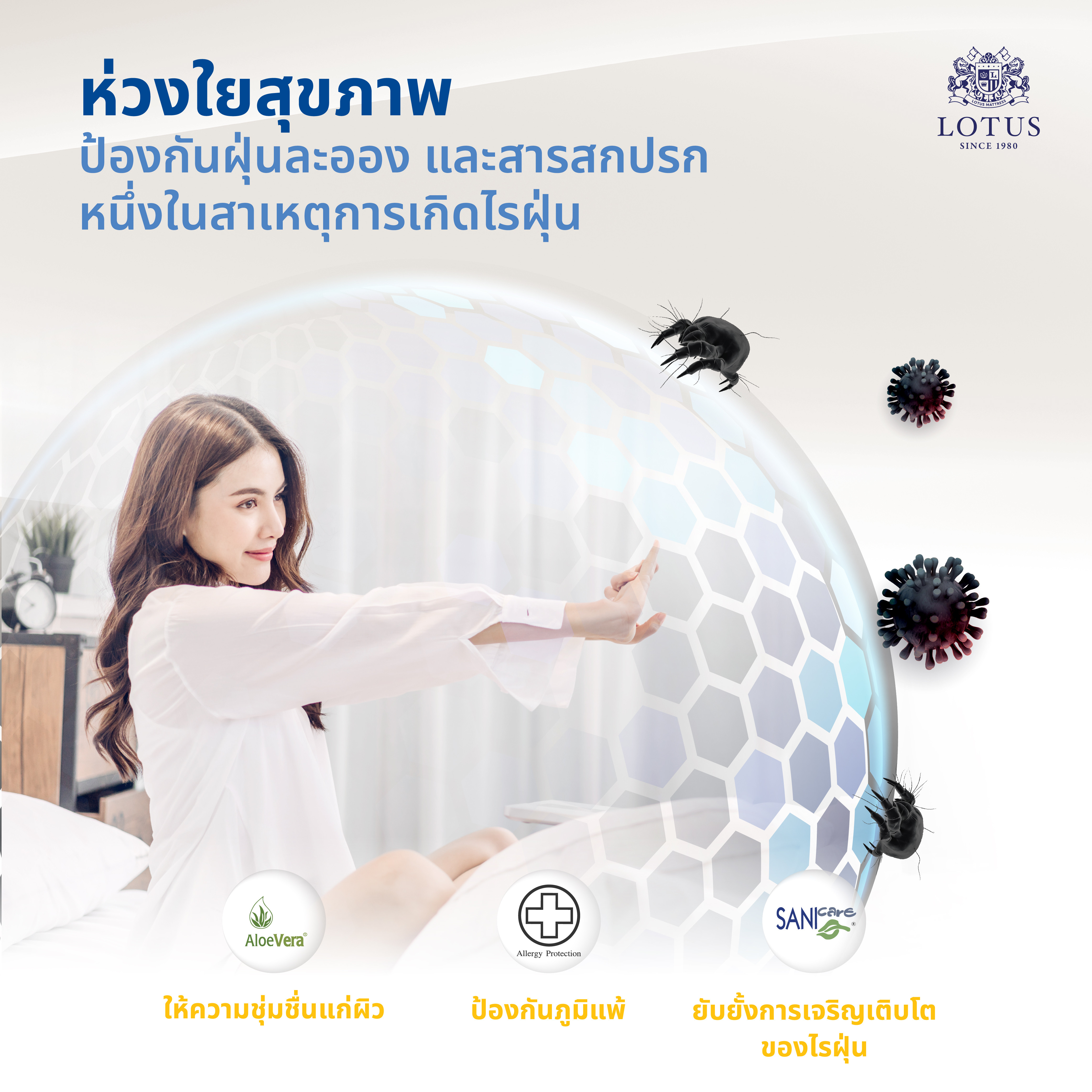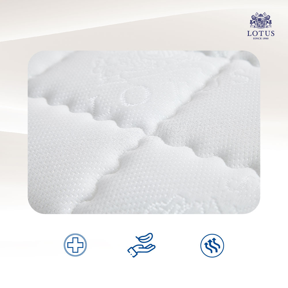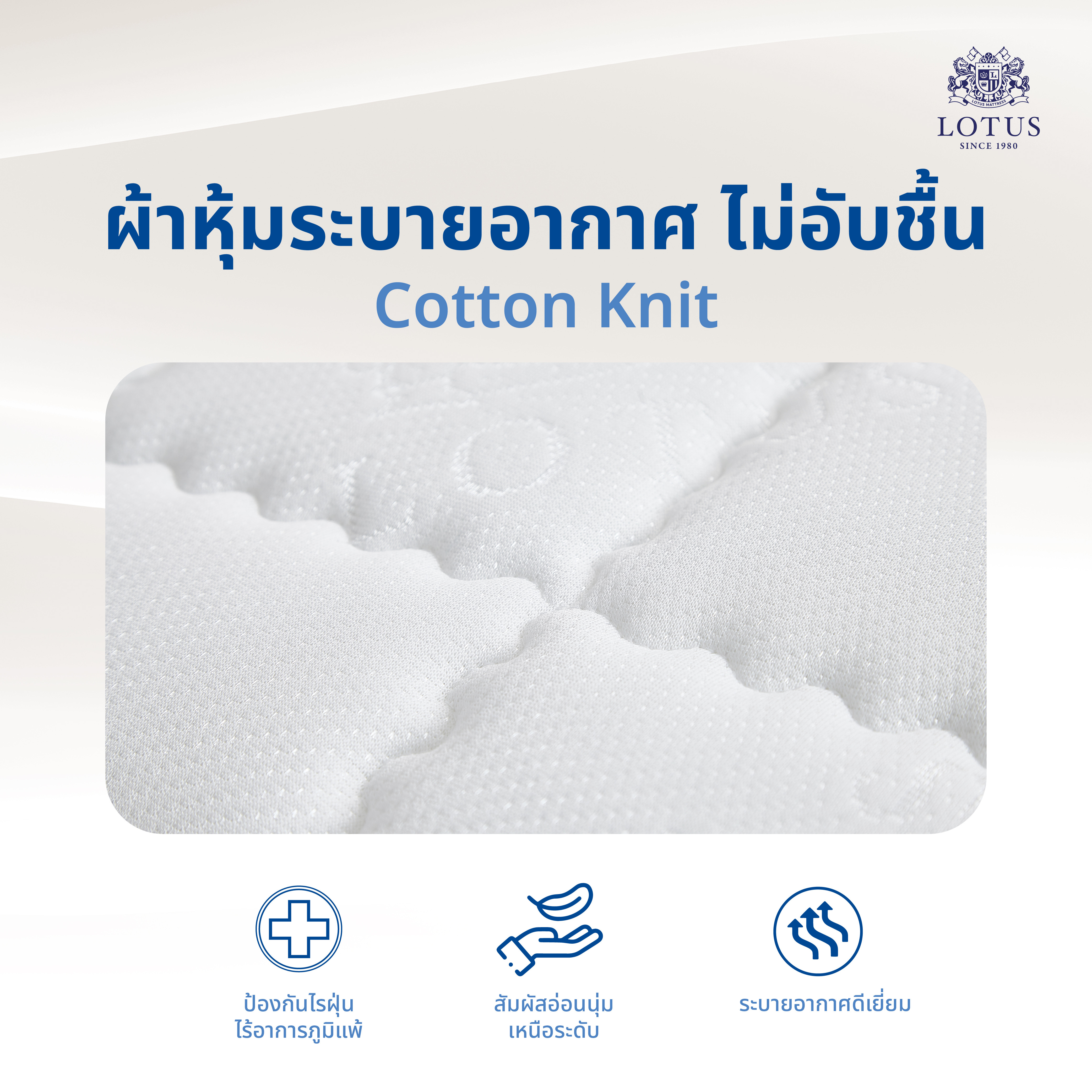 เสริมสัมผัสสบายไร้การระคายเคืองกับผ้าหุ้ม Cotton knit ที่นุ่มนวลและสามารถระบายอากาศได้อย่างมีประสิทธิภาพ จึงช่วยให้ผิวสัมผัสที่นอนแห้งสนิทไม่อับชื้น พร้อมช่วยยับยั้งการสะสมของไรฝุ่นและแบคทีเรียเพื่อป้องกันการเกิดอาการภูมิแพ้ ให้คุณหลับสนิทและมีสุขภาพที่ดีไปพร้อมกัน