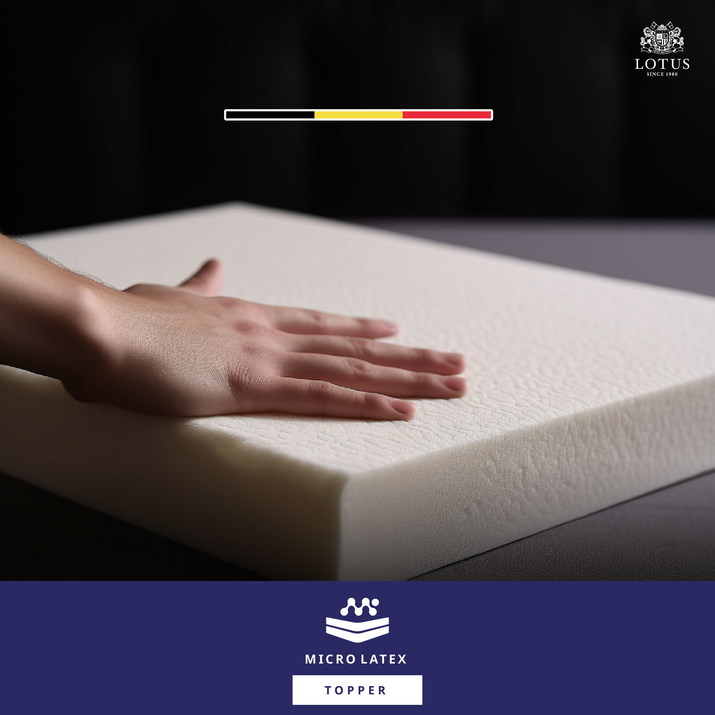 • Micro Latex Topper ไมโครลาเท็กซ์จากประเทศเบลเยียม ระบบการนำยางพาราธรรมชาติผ่านกระบวนการเทคโนโลยีลิขสิทธ์เฉพาะของที่นอนโลตัสทำให้ยางพารามีโมเลกุลขนาดเล็ก เพื่อให้ได้ค่า ILD – Indentation Load Deflection (ค่าแรงสะท้อนกลับ) ที่สูง ให้สัมผัสที่แน่นอย่างลงตัว พร้อมการกระจายและปรับสมดุลน้ำหนักอย่างมีประสิทธิภาพ