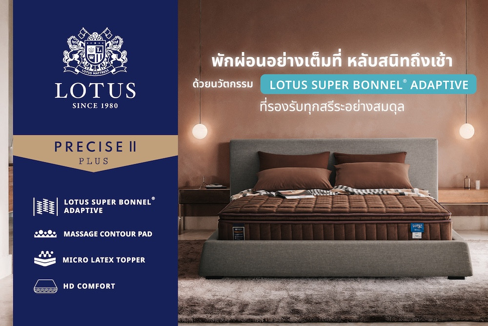 สร้างความรู้สึกผ่อนคลายที่พิเศษยิ่งกว่า เติมเต็มช่วงเวลาแห่งการพักผ่อนที่เต็มไปด้วยคุณภาพกับที่นอน LOTUS รุ่น Precise II Plus ด้วยการรองรับของระบบสปริง LOTUS Super Bonnel® Adaptive ที่ออกแบบให้สามารถปรับสมดุลการรองรับตามน้ำหนักและสรีระร่างกายของผู้นอน