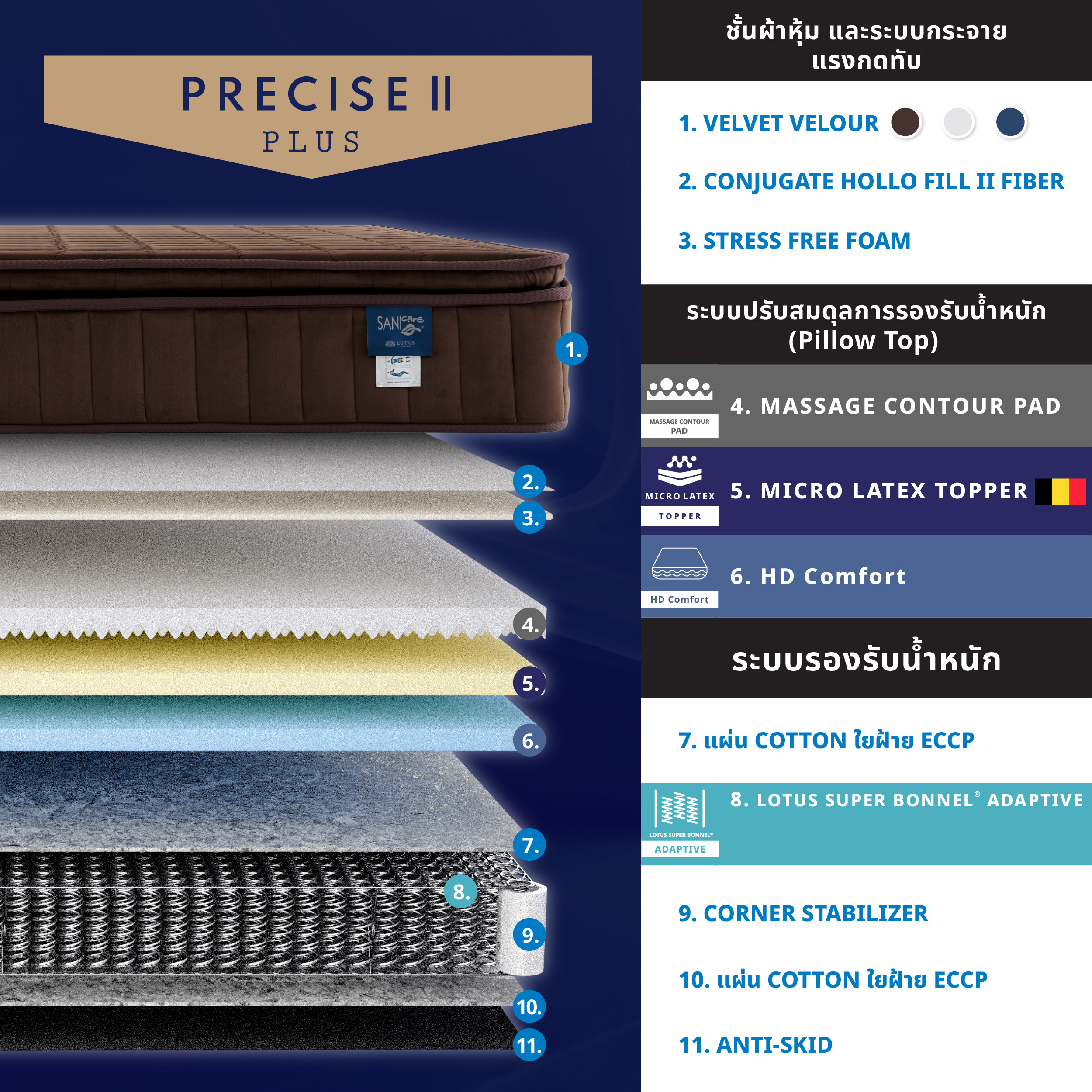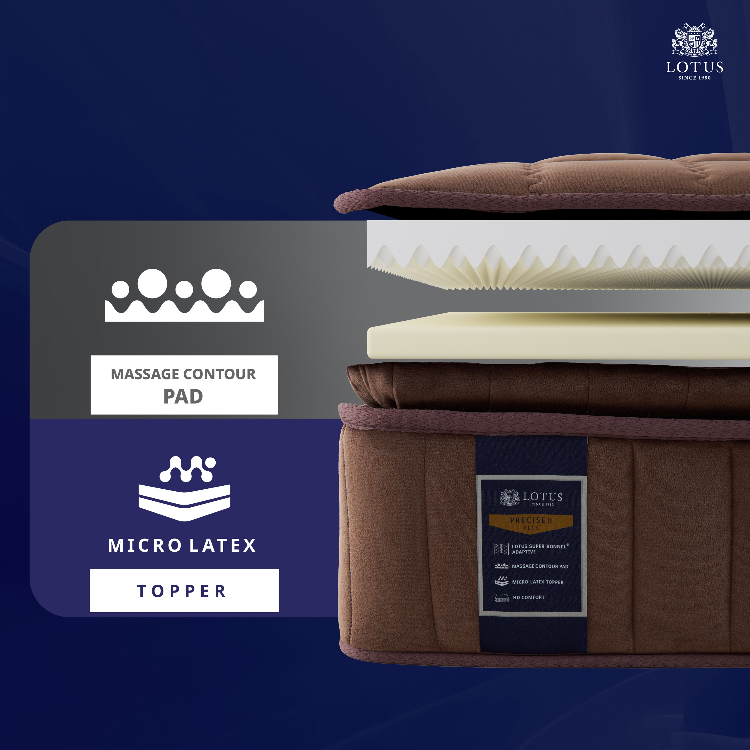 สร้างความรู้สึกผ่อนคลายที่พิเศษยิ่งกว่า เติมเต็มช่วงเวลาแห่งการพักผ่อนที่เต็มไปด้วยคุณภาพกับที่นอน LOTUS รุ่น Precise II Plus ด้วยการรองรับของระบบสปริง LOTUS Super Bonnel® Adaptive ที่ออกแบบให้สามารถปรับสมดุลการรองรับตามน้ำหนักและสรีระร่างกายของผู้นอน และเสริมการรองรับให้มีประสิทธิภาพมากยิ่งขึ้นด้วย Massage Contour Pad ที่มีผิวสัมผัสแบบปุ่มนวด ช่วยนวดผ่อนคลายแผ่นหลังและจุดต่างๆ ของร่างกาย เสริม Micro Latex Topper ยางพาราที่ปรับโครงสร้างให้มีขนาดเล็ก เพิ่มความยืดหยุ่นและนุ่มนวล สามารถโอบอุ้มสรีระและสลายแรงกดทับได้อย่างเป็นธรรมชาติ ให้สัมผัสการนอนที่นุ่มสบาย เพิ่มความผ่อนคลายในทุกค่ำคืน พร้อมมอบสัมผัสนุ่มนวลด้วยผ้าหุ้ม Velvet-velour ที่ให้สัมผัสนุ่มละมุนคล้ายขนแกะ อ่อนโยนต่อผิว ลดการระคายเคืองและระบายอากาศได้ดี ช่วยลดความอับชื้นสะสม ปรับความรู้สึกให้คุณเข้าสู่การพักผ่อนง่ายยิ่งขึ้น และหลับสนิทยาวนานตลอดคืน