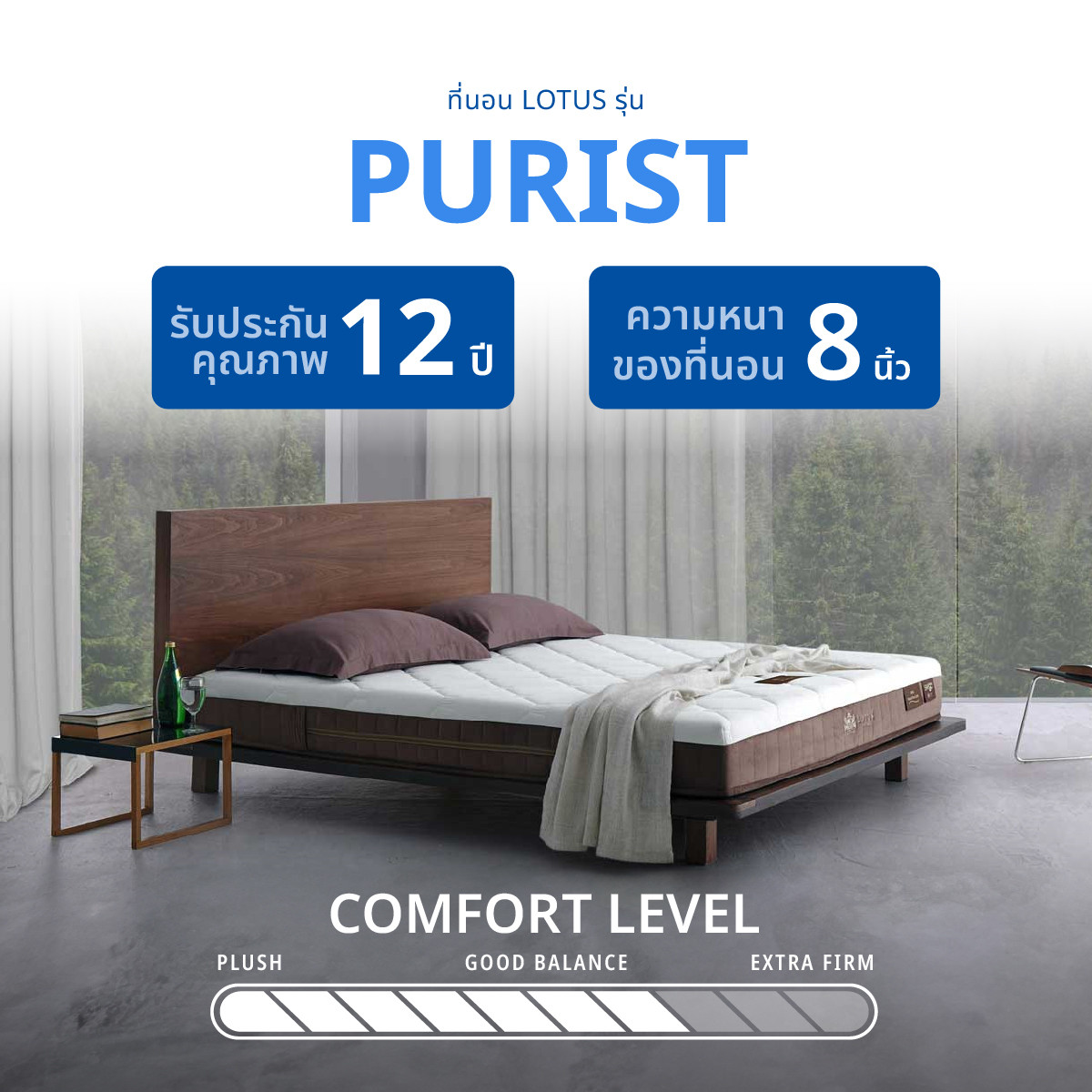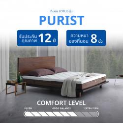 ที่นอน LOTUS รุ่น Purist ที่นอนยางพาราธรรมชาติ 100% ปราศจากสารเคมี ลิขสิทธิ์เฉพาะของ LOTUS พร้อมมอบการนอนหลับที่ถูกสุขลักษณะ ให้คุณสัมผัสความผ่อนคลายอันบริสุทธิ์ที่จะเปิดโอกาสสู่ความสมดุลลงตัวกับนวัตกรรมแห่งการพักผ่อนอันสมบูรณ์แบบ