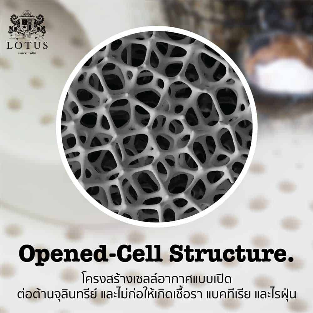 มีความยืดหยุ่นสูงด้วยโครงสร้าง Opened-cell เซลล์ระบายอากาศแบบเปิด เพิ่มการไหลเวียนของอากาศที่สามารถต่อต้านการเกิดแหล่งสะสมของแบคทีเรีย (Anti-bacteria) และไรฝุ่น (Anti-dust mite) มอบความสดชื่นปลอดโปร่งให้คุณหลับสนิทตลอดคืน