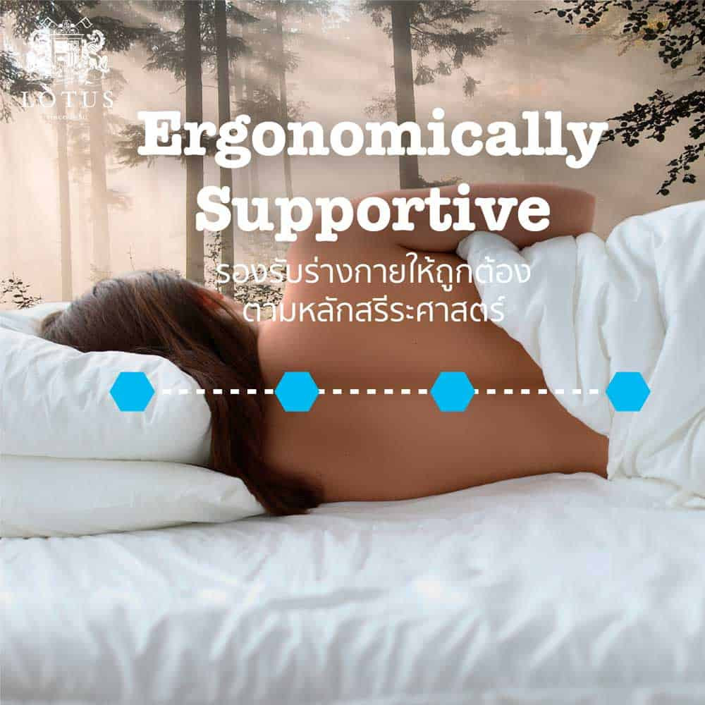 มีประสิทธิภาพกระจายน้ำหนักเพื่อสลายแรงกดทับของร่างกายอันเป็นคุณสมบัติเด่นของที่นอนยางพาราธรรมชาติ 100% รองรับทุกสัดส่วนร่างกายได้อย่างถูกต้องตามหลักสรีรศาสตร์ ช่วยจัดแนวกระดูกสันหลังให้ถูกสุขลักษณะการนอน พร้อมเพิ่มระดับการหมุนเวียนโลหิตสู่การนอนหลับที่จะเติมเต็มสุขภาพของคุณในระยะยาว