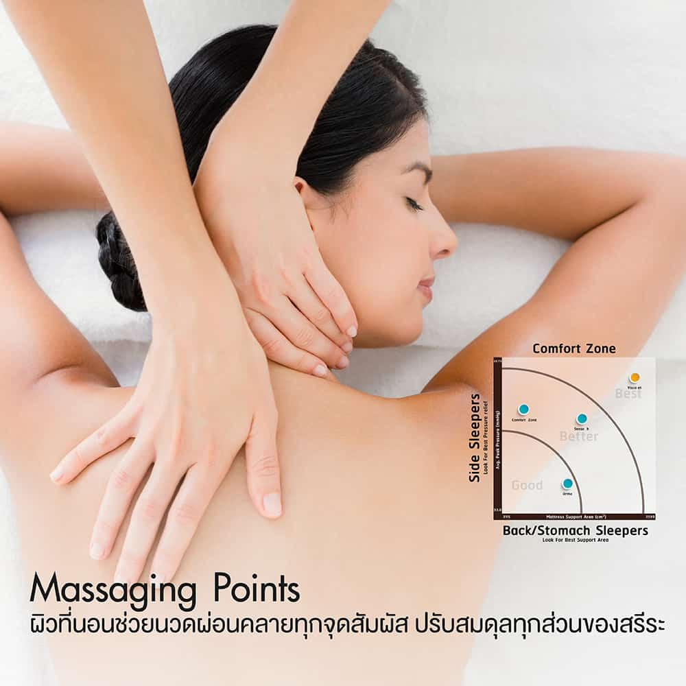 • Massaging Points บนผิวที่นอนช่วยนวดผ่อนคลายทุกจุดสัมผัส ปรับสมดุลทุกส่วนของสรีระ