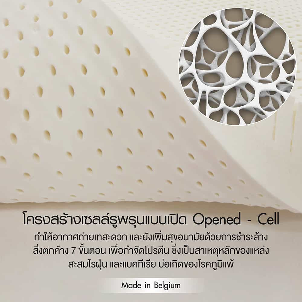 • ท็อปเปอร์โฟมลาเท็กซ์ธรรมชาติระบบ ทาลาเลย์ (Talalay) 2 ชั้น (50 mm.) โครงสร้างเซลล์รูพรุน แบบเปิด opened-cell ผลิตในประเทศเบลเยี่ยมด้วยเทคโนโลยีชั้นสูงสุด ที่ยังเพิ่มสุขอนามัยด้วยการชำระล้างสิ่งตกค้าง 7 ขั้นตอนเพื่อกำจัดโปรตีนซึ่งเป็นสาเหตุหลักของแหล่งสะสมไรฝุ่น และแบคทีเรีย บ่อเกิดของโรคภูมิแพ้