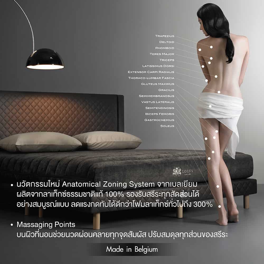 • นวัตกรรมใหม่ Anatomical Zoning System จากเบลเยี่ยม ผลิตจากลาเท็กซ์ธรรมชาติแท้ 100% ออกแบบพิเศษเฉพาะให้มีคุณสมบัติโดดเด่นในการยืดหยุ่น รองรับโครงสร้างสรีระทุกสัดส่วนได้อย่างสมบูรณ์แบบ ลดแรงกดทับได้ดีกว่าโฟมลาเท็กซ์ทั่วไปถึง 300%