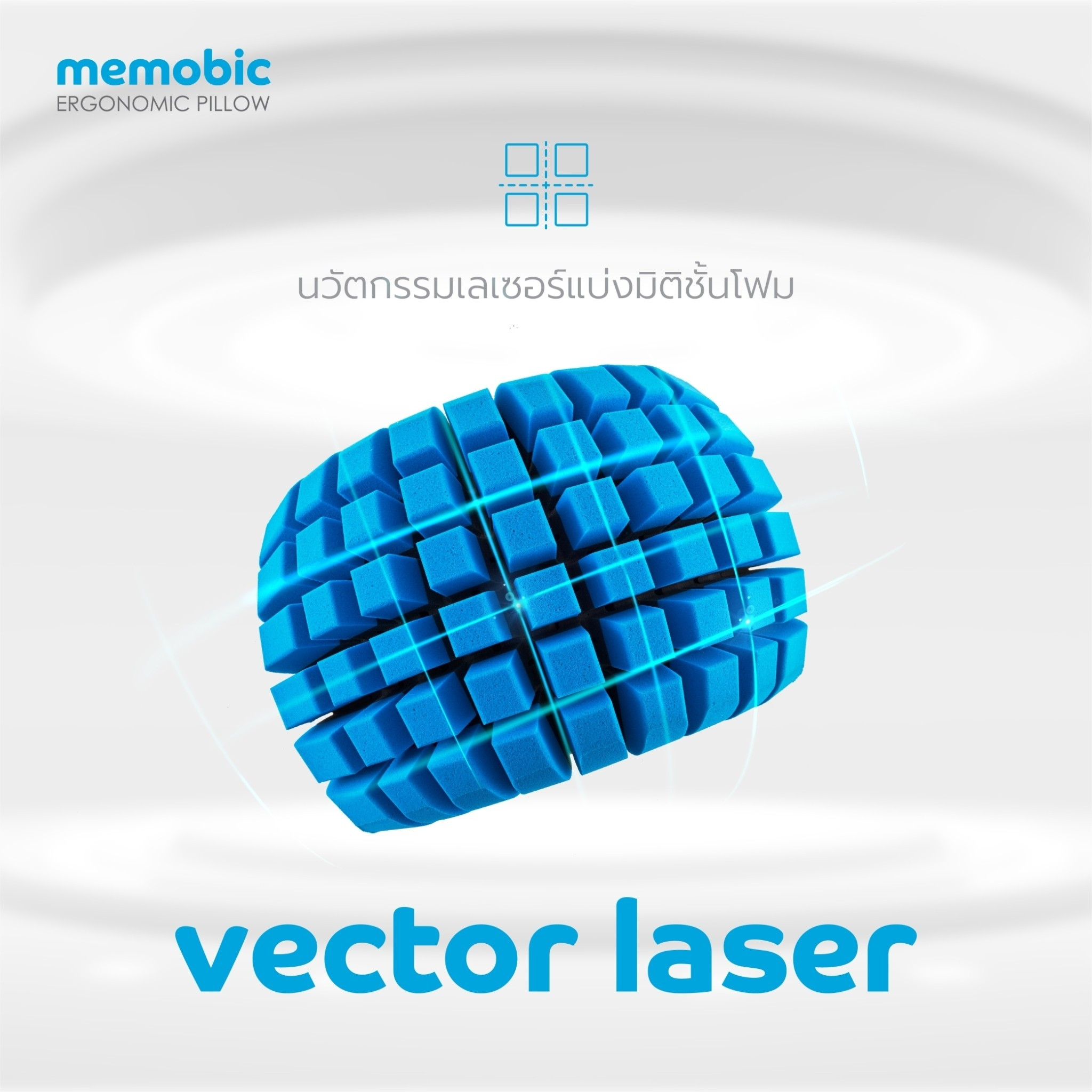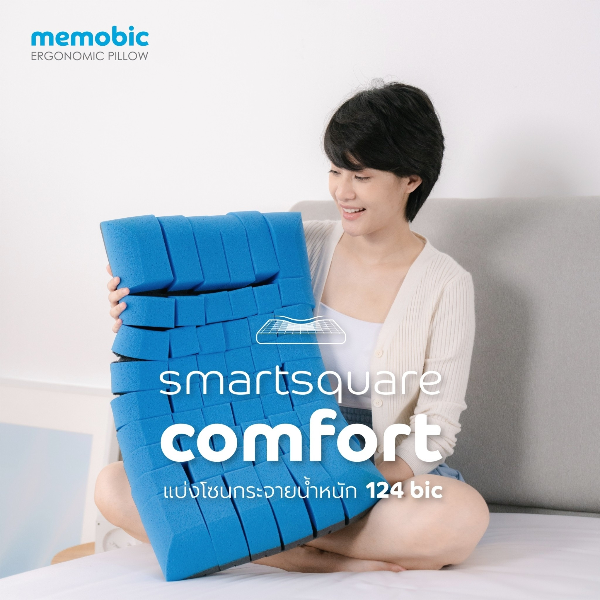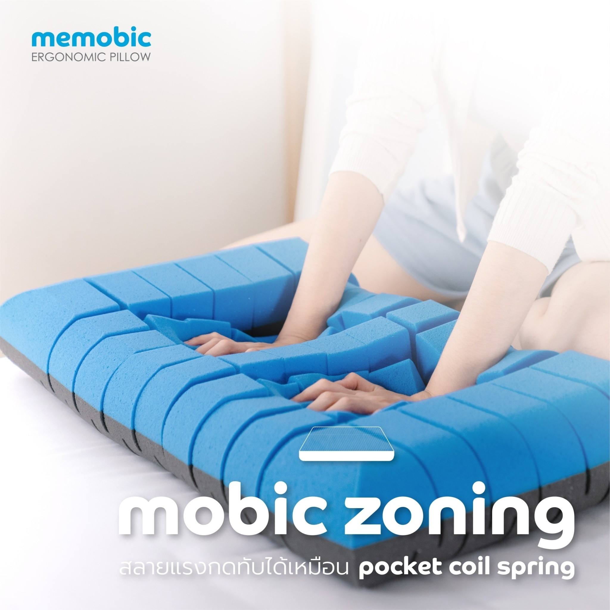 MEMOBIC ERGONOMIC PILLOW ใช้กระบวนการผลิตที่ทันสมัยพร้อมเทคโนโลยี MOBIC ZONING เพื่อแบ่ง MEMOBIC FOAM ออกเป็นรูปทรง CUBIC มอบสัมผัสโอบอุ้มนุ่มนวล รองรับกับรูปทรงศีรษะอย่างสมดุล ซึ่งทำหน้าที่เหมือน Pocket coil spring ของที่นอนคุณภาพสูง แบ่งโซนกระจายน้ำหนักมากถึง 124 ก้อน ช่วยลดแรงกดทับเฉพาะจุดสร้างความผ่อนคลายให้กล้ามเนื้อบริเวณ คอ บ่า ไหล่ ไม่เกิดแรงกดทับเส้นประสาทบริเวณศีรษะอย่างถูกต้องตามหลักสรีรศาสตร์ อีกทั้งช่วยระบบไหลเวียนโลหิตบริเวณศีรษะที่ส่งผลต่อการทำงานของสมองให้ทำงานอย่างมีประสิทธิภาพมากยิ่งขึ้น มอบความสบายให้คุณหลับสนิทตลอดทั้งคืน