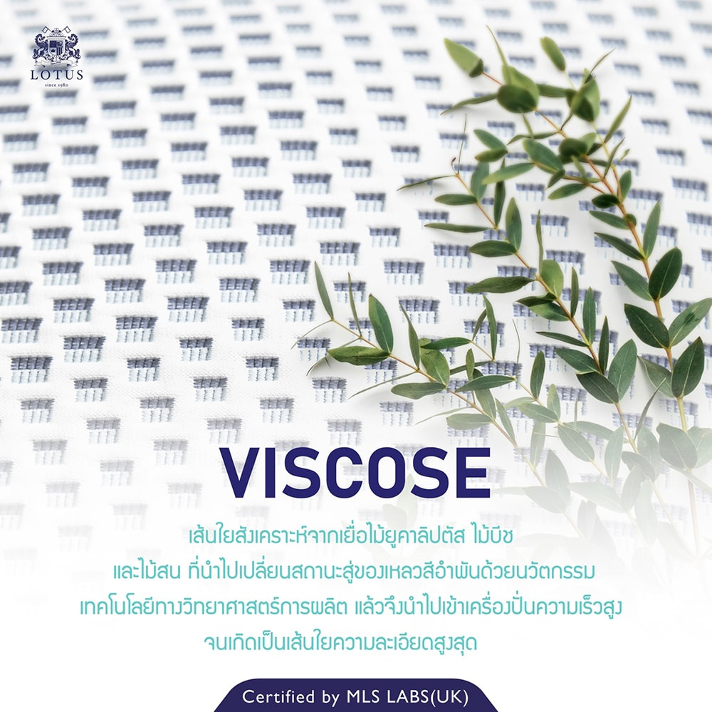 Viscose เป็นเส้นใยอเนกประสงค์มีคุณสมบัติสบายเช่นเดียวกับเส้นใยธรรมชาติให้ความรู้สึกผิวสัมผัสเหมือนกับผ้าไหม มีความนุ่มลื่น เย็นสบาย และซึมซับได้ดี เหมาะอย่างยิ่งสำหรับการใช้งานในสภาพอากาศร้อนและชื้น ผสานเข้ากับเทคโนโลยี BI-OME AV เคลือบลงในอนุภาคของเส้นใย Viscose ก่อนนำมาถักทอเป็นผืนผ้า ทำให้เกิดประสิทธิภาพยับยั้งแบคทีเรียและไวรัส ได้อย่างคงทนยาวนานปราศจากเชื้อโรค ให้คุณพักผ่อนได้อย่างปลอดภัย
